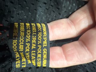 Cazadora de motorista de piel con un diseño llamativo. - Combinación de colores rojo y negro. - Logo de la marca Levior en varias partes de la prenda. - Cuello redondo con cierre. - Cremallera frontal. - Cinturón ajustable en la parte inferior.