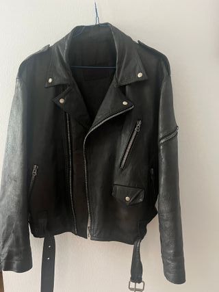 Chaqueta de piel con un diseño único y detalles desgastados. - Cierre frontal con cremallera y broches. - Cuello alto ajustable. - Bolsillos frontales con solapa. - Hebillas y correas decorativas.ver fotos cuidadosamente!!!