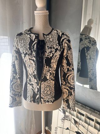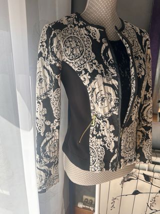 Chaqueta estampada, negro y crema. Talla 38, mide 41 de hombros, 43 cm de sisas, 50 cm largo espalda y 57 cm mangas. Tejido elastico, muy comoda. Los vivos del cuello y pecho son tiras efecto piel. Cierra con cremallera, tiene 2 bolsillos con cremalleras. Novedades y ofertas, todas las semanas prendas nuevas, calzado y complementos