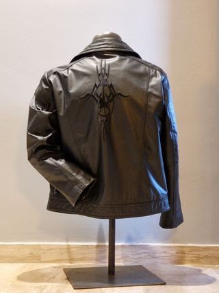 Chaqueta negra de piel auténtica con señales de uso en hombro izquierdo y espalda y rozaduras en mangas.