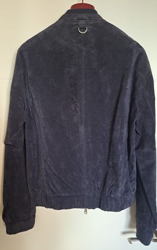 Cazadora tipo bomber de la línea Mango Man en color azul marino, completamente nueva a estrenar (fue un regalo por error de talla). Está confeccionada en 100% piel de porcino con un acabado de ante muy suave, corte entallado, cuello coreano y cierres metálicos con cremallera de doble carro. Una prenda premium impecable, sin marcas ni uso. Medidas y detalles: Talla: S. Ancho de hombros: 45 cm. Largo total: 64 cm. Tengo más chaquetas de hombre en mi perfil.
