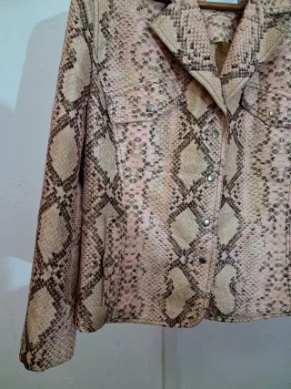 Chaqueta con un llamativo estampado que imita la piel de serpiente. - Diseño con solapas clásicas. - Cierre frontal con botones. - Dos bolsillos en la parte delantera. La etiqueta pone una 48 pero realmente podría estar entre una L y una XL. Medidas: Hombros: 43 cm Axila: 52 cm Largo: 58 cm