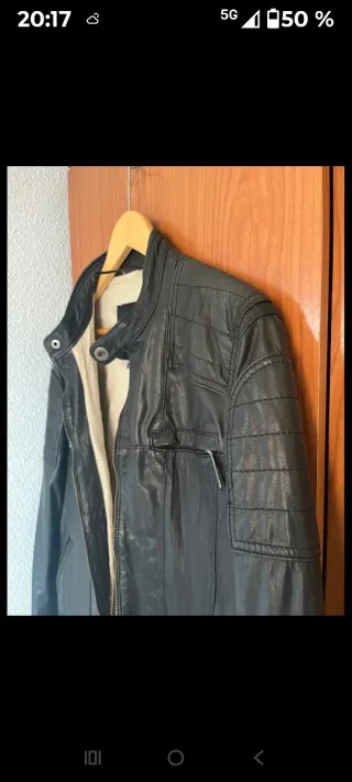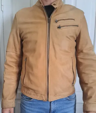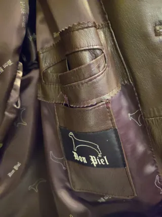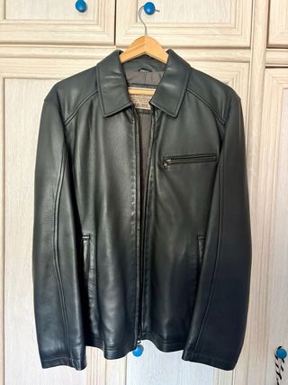 Chaqueta de cuero Easy Wear de El Corte Inglés, talla 52, de hombre. Es de piel ovina natural. Tiene unos 20 años, desgaste propio del uso y con una marca en el lado izquierdo de una pegatina que dejó señal (ver foto). Por lo demás, el botón del bolsillo interior algo descosido y algún roce menor. El tirador de la cremallera se lo cambié hace unos años. Es una talla 52, habitualmente uso una M y me queda bien, complexión delgada y altura media.