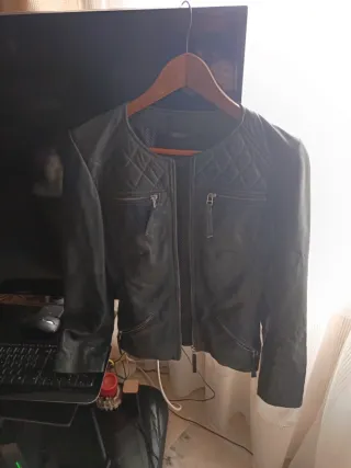 Chaqueta de chica de piel con un diseño moderno y elegante. Muy poco uso y la vendo por hacer hueco en armario. Una maravilla de chaqueta que he conservado muy bien y con mucho cariño. - Cuello redondo con cierre de botón. - Cremallera frontal. - Dos bolsillos superiores con cremallera. - Dos bolsillos inferiores con solapa y botón. Precio en tienda 190€ Medidas: Hombros: 40 cm Axila: 38 cm Largo: 55cm