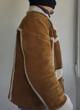 Chaqueta de hombre de la marca Zara, en color beige. Es una prenda de vestir elegante y cómoda, ideal para cualquier ocasión. - Talla: L. Las medidas en las fotos - Material: Piel vuelta - Cierre: Botones y se encuentra forrado. - Bolsillos: Sí - Estado: Usado, en buen estado.