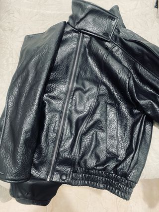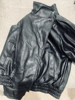 Chaqueta de estilo motero con acabado en efecto piel. - Cierre de cremallera frontal. - Dos bolsillos con cremallera en el pecho. - Dos bolsillos inferiores con cremallera. - Puños con cremallera. Tiene un detallito en la parte de atrás de una manga, nada relevante