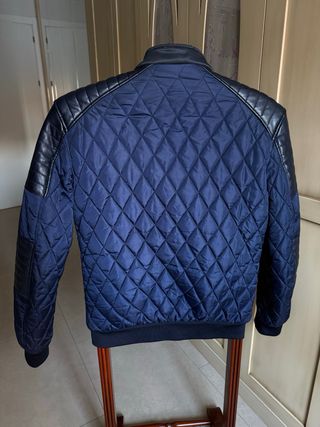 Cazadora estilo bomber para hombre. - Cierre de cremallera frontal. - Bolsillo con cremallera en el pecho. - Dos bolsillos laterales con cremallera. - Puños y bajo elásticos. - Tacto ante o piel vuelta. Formula joven Sólo usada un par de veces. Está forrada y el gordita.