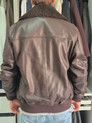 Bomber di pelle massiccia Kiabi modello aviatore type A-1. Interno con fodera in pelo removibile, perfetto per inverno e mezze stagioni. Ragazzo in foto alto 183cm. Misure: Spalla-spalla 55cm Ascella-ascella 63cm Manica 66cm Lunghezza tot 72cm