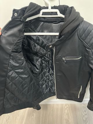 Chaqueta de piel sintética con un diseño moderno y detalles de costura. Usada 3 veces contadas si llega . - Cierre frontal con cremallera. - Bolsillos con cremallera. - Puños y bajo elásticos. - Capucha integrada.