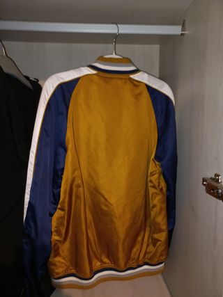 Chaqueta dorada con mangas azules y blancas, talla S, nueva, sin ningún uso. tiene banda elástica en la cintura que se ajusta a la cadera.