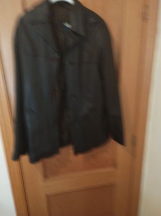 Elegante chaqueta de cuero para caballero, talla 56. Es de color negro y tiene un diseño clásico. - Forro acolchado. - Cierre de botones. - Bolsillos laterales. Tiene una pequeña costura al lado del bolsillo derecho por un enganche. El arreglo no se aprecia a simple vista. Se ha usado de forma ocasional.
