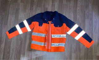 Chaqueta de trabajo con detalles de alta visibilidad. - Diseño bicolor en azul y naranja. - Bandas reflectantes horizontales y verticales. - Cierre frontal con botones a presión. - Dos bolsillos en el pecho con solapa.