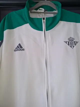 Chaqueta deportiva del Betis. - Diseño con los colores verde y blanco. - Logo de Adidas. - Rayas grises en las mangas.