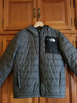 Precio algo negociable. Chaqueta The North Face con capucha y cremallera frontal. Presenta un diseño acolchado y un bolsillo en el pecho. - Color gris jaspeado con detalles en negro. - Capucha integrada. - Bolsillo frontal con cremallera. - Talla L Junior