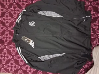 Conjunto deportivo del Real Madrid. - Chaqueta con cremallera completa. - Pantalones largos. - Logos de Adidas y escudo del club. - Tallas disponibles: S, M, L, XL, XXL.