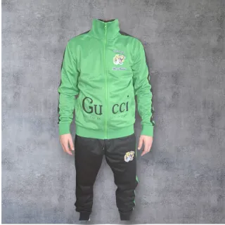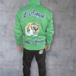 Conjunto deportivo de dos piezas con un diseño llamativo. - Chaqueta verde con estampado de tigre y texto. - Pantalón negro con detalles laterales verdes y estampado de tigre. - Cremallera frontal en la chaqueta.