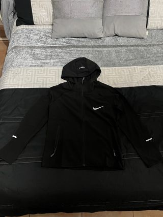 Chaqueta deportiva Nike en color negro, ideal para correr. - Diseño con capucha. - Cremallera frontal completa. - Bolsillos laterales con cremallera. - Detalles reflectantes en mangas.