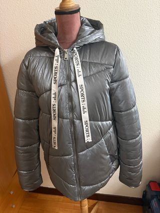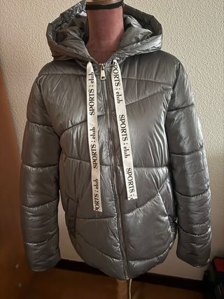 Chaqueta acolchada con un acabado brillante y moderno. Perfecta para añadir un toque de estilo a tu look. - Diseño acolchado. - Cierre de cremallera frontal. - Capucha integrada. - Cinta decorativa con texto en las solapas de la cremallera. Medidas: Longitud 68cm Distancia entre hombros 42cm Distancia de sisa a sisa 55cm Longitud mangas 65cm