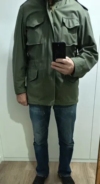 Chaqueta estilo militar M65 de alpha Indusries. Small regular. Está como nueva. Verde militar muy bonito. Mido 1,80 m y peso 81 kg. Creo que me va perfecta. Casi no me la pongo, pensaba que me la iba a poner más. Está muy rebajada.