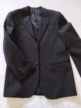 Traje de chaqueta azul marino, con un solo uso por cambio de talla. -Chaqueta de diseño clásico con solapa y ojal. Dos bolsillos frontales y uno superior. Cierre de dos botones. Puños con botones. -Pantalón con dos bolsillos delanteros y dos traseros, más uno pequeño monedero cerca del cinturón. Ideal para graduaciones y otras fiestas.
