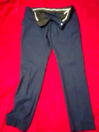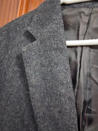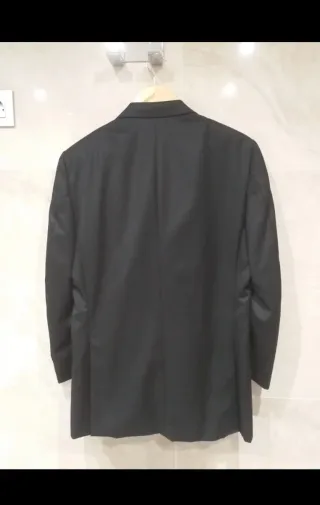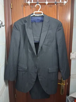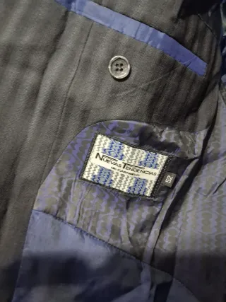 Elegante traje de chaqueta talla 38, tiene un pequeño orificio en el pantalón. - Chaqueta con solapa clásica. - Pantalón con pinzas.