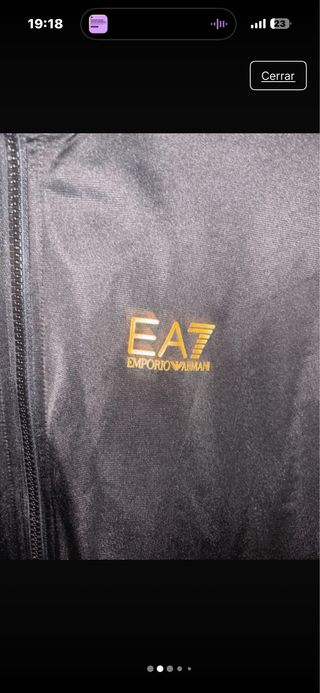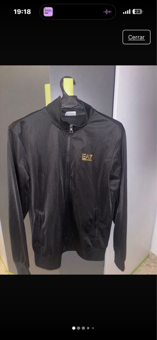 Conjunto deportivo EA7 para hombre. - Chaqueta con cremallera completa. - Diseño elegante en negro con detalles dorados. - Cuello alto.