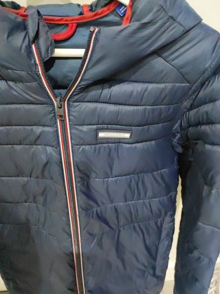 Chaqueta acolchada de la marca Tommy Hilfiger. Talla S. Original. Muy buen estado general. Lleva una mancha de boli/rotulador en el gorro/capucha, en la parte trasera de la chaqueta (se quita con un lavado).