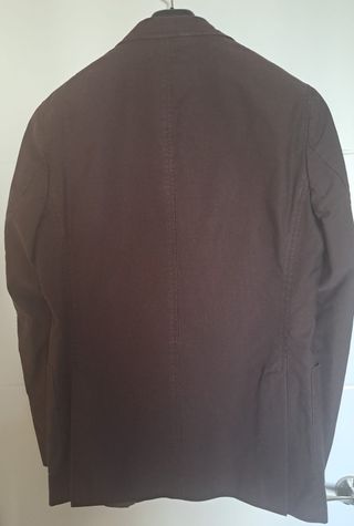 Elegante chaqueta americana para hombre de la marca Massimo Dutti en un versátil color marrón chocolate. Es una prenda perfecta para un look casual-elegante, ideal tanto para oficina como para eventos informales. Detalles de composición y diseño: Exterior: 100% Algodón, con un tejido de gran calidad y tacto muy agradable. Forro: Combinación de 74% algodón y 26% nylon, lo que la hace ligera y confortable. - Talla: 48. - Estado: La prenda está como nueva, ya que solo se ha utilizado en un par de ocasiones. Está impecable y muy bien cuidada. - Medidas: Ancho de hombros: 44 cm. Largo total: 78 cm.