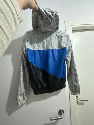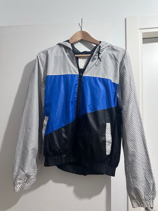 Chaqueta cortavientos con un diseño moderno y deportivo. - Mangas y paneles laterales con estampado de puntos. - Paneles de color azul y negro en la parte frontal. - Capucha integrada. - Bolsillos laterales.