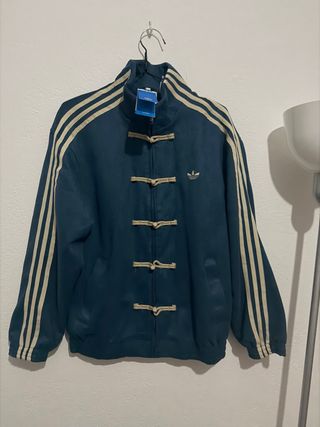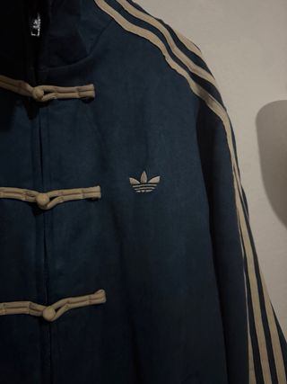 Chaqueta deportiva Adidas con un diseño inspirado en el Año Nuevo Chino. - Cierre de cordones estilo oriental. - Tres rayas icónicas en las mangas. - Pequeño logo de Adidas bordado.
