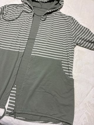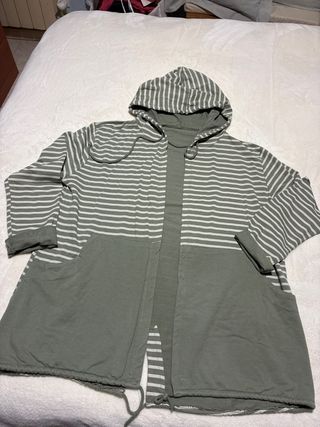 Chaqueta larga con diseño de rayas horizontales y un corte náutico. Confeccionada en 97 % algodón y 3% elastano para mayor comodidad. Usada solo en una ocasión - Diseño a rayas blancas y verdes. - Capucha integrada. - Bolsillos laterales. - Medidas: Hombros 50 cm Axila 58 cm Largo 71 cm