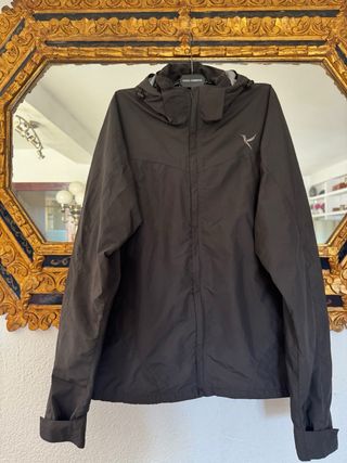 Chaqueta en color oscuro . Diseño moderno y versátil. con dos bolsillos - Capucha integrada. - Cierre de cremallera frontal. - Logo distintivo en el pecho.