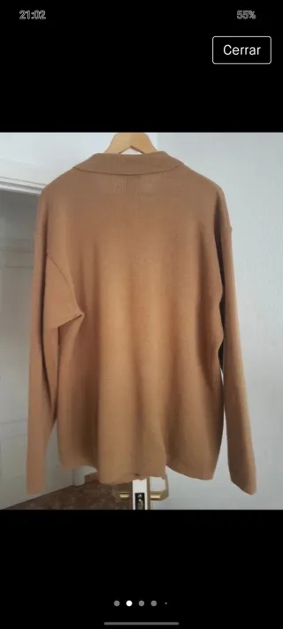 Chaqueta de estilo moderno, en color mostaza y talla 50. Precio original 60 euros. - Diseño sin cuello. - Cierre de cremallera frontal. - Detalle de botones en el cuello.
