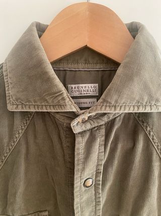 Preciosa camisa en micropana superfina de algodón de la prestigiosa firma Brunello Cucinelli. Talla M Es de color verde oliva pálido, muy favorecedora y de un tejido muy agradable, cómoda, se deja llevar con gusto. Diseño atemporal, estilo vaquero con botones automáticos. Fácil de conjuntar. Llevarla siempre da un toque singular tanto cerrada como abierta, más informal, a modo de chaqueta ligera con una camiseta básica debajo. Tejido agradable que no pesa y no ocupa espacio al viajar. Es una prenda que gusta tener en el vestidor también por su versatilidad. Ha sido poco usada y muy cuidada. Precio en tienda superior a 500€