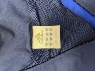 Chaqueta deportiva vintage de Adidas en buen estado. Diseño clásico con detalles icónicos. - Color principal azul con paneles negros. - Tres rayas blancas laterales. - Cuello alto.