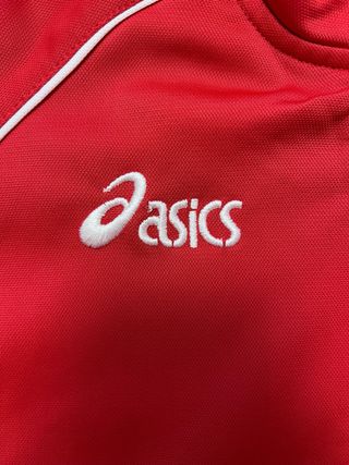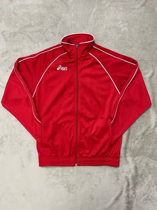 Chaqueta deportiva ASICS de color rojo, ideal para actividades físicas o uso casual. Presenta un diseño clásico con detalles blancos. - Cierre completo con cremallera. - Cuello alto. - Logo de ASICS bordado en el pecho.