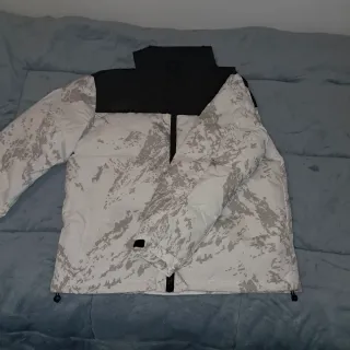Chaqueta acolchada con un diseño moderno. - Parte superior en negro. - Estampado de camuflaje en blanco y gris en el resto de la prenda. - Cuello alto. sin marca