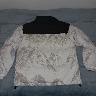 Chaqueta acolchada con capucha. - Diseño en bloques de color negro, blanco y gris. - Cierre de cremallera frontal. - Bolsillos laterales con cremallera. No está en perfecto estado pero sí bastante bien. En la espalda tiene unas pequeñas marcas, pero apenas se notan, y menos estando en la espalda