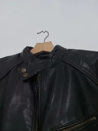 Chaqueta de estilo motero en color negro. Presenta un diseño moderno y versátil. - Cierre de cremallera frontal. - Cuello con botón a presión. - Bolsillos con cremallera. - Bolsillos interiores.