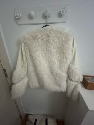 Chaqueta de vestir con detalles de pedrería y pelo sintético. - Diseño elegante. - Adornos de pedrería en los bordes. - Mangas y cuello con pelo sintético.