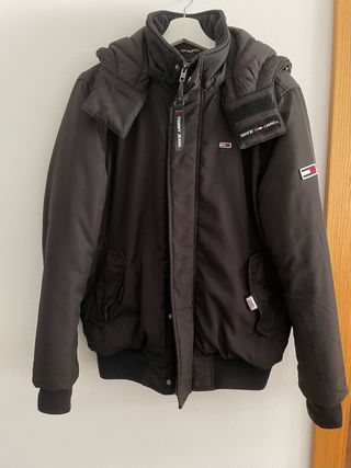 Chaqueta Tommy Jeans de color negro. Cuenta con capucha y varios bolsillos. - Cierre de cremallera. - Puños y bajo elásticos. - Detalle de logo en la manga.