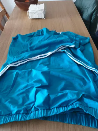 Chaqueta unixes ligera con capucha y cierre de cremallera, ideal para la lluvia, tiene un plástico que lo puedes poner o quitar y te cubre la cara. - Diseño con bolsillos frontales. - Puños y bajo elásticos. - Tejido impermeable. Talla xl pero da talla vale para una 48.