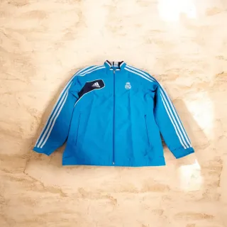 Chaqueta de entrenamiento oficial del Real Madrid. - Diseño deportivo con las icónicas tres rayas de Adidas en las mangas. - Escudo del Real Madrid bordado en el pecho. - Cierre completo con cremallera. - Cuello alto.