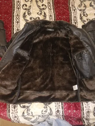 Chaqueta de hombre con forro interior de pelo. - Material exterior de cuero. - Diseño con cuello y puños forrados. - Cierre de cremallera.