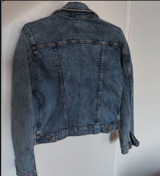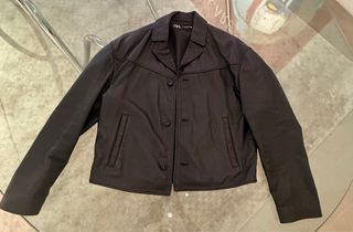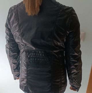 Chaqueta de estilo moderno y versátil. - Diseño con cuello redondo. - Cierre de cremallera frontal. - Bolsillos laterales. - Detalle de costuras en hombros. Nueva le quite la etiqueta y solo puesta una vez , pero me va muy justa.