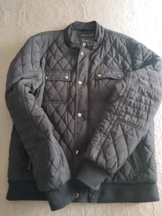 Chaqueta de la marca Zara en color negro. Diseño moderno y versátil. - Cierre frontal con cremallera. - Múltiples bolsillos con cremallera y botón. - Cuello alto. - Puños y cintura elásticos.