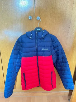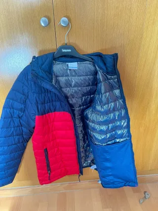 Chaqueta acolchada plumón con capucha. - Diseño bicolor. - Mangas y capucha en azul. - Cuerpo principal en rojo. - Capucha con cierre ajustable - Forro interior termoreflectante - Bolsillos laterales con cremallera 60€. No se hacen envíos