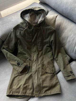 Chaqueta de estilo parka con forro interior de borreguito. - Capucha con cordones. - Cierre de cremallera y botones. - Dos bolsillos delanteros con solapa. - Puños ajustables con botón.