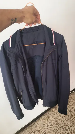 Chaqueta de la marca Tommy Hilfiger en color azul. Presenta un diseño moderno y detalles distintivos. - Cuello con banda de colores (rojo, blanco, azul). - Cierre de cremallera frontal. - Bolsillos laterales con cremallera. - Detalle de logo en la manga.