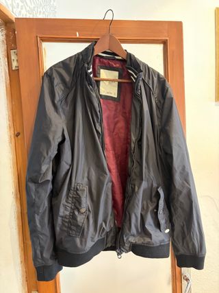 Chaqueta estilo bomber de Zara. - Cierre de cremallera frontal. - Bolsillos laterales con cremallera. - Bolsillo frontal con botón a presión. - Cuello redondo.